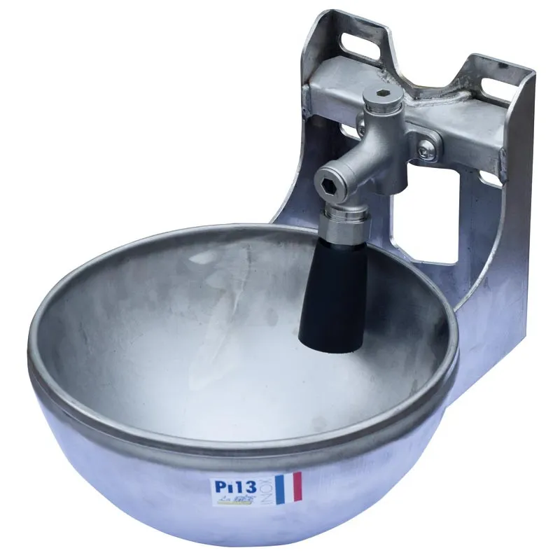 Stainless steel one-piece drinker, single bowl with curved rim (limiting splashing). Fastening with a stainless steel wall mounting plate by oblong holes. Can be directly fitted on a metallic post with no specific flange.