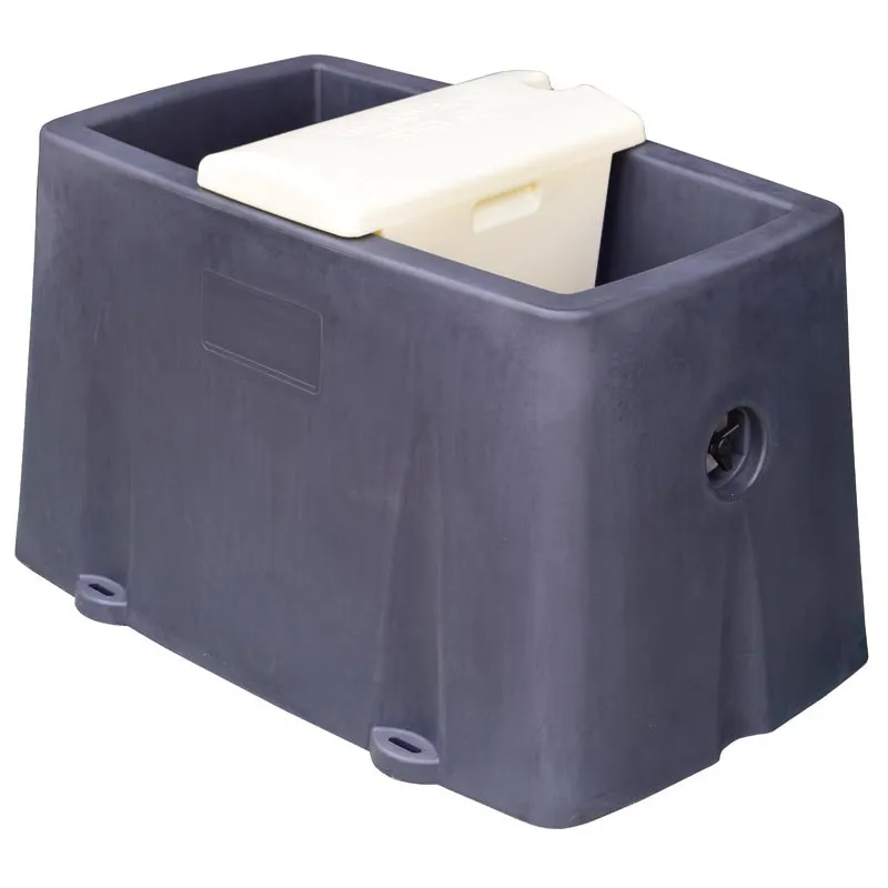 Monobloc trough with slope for easy draining. Float valve is protected by a rotomolded double wall housing right in the middle to create 2 different drinking trough spaces.