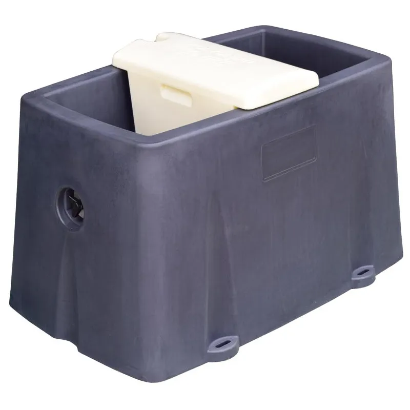 Monobloc trough with slope for easy draining. Float valve is protected by a rotomolded double wall housing right in the middle to create 2 different drinking trough spaces.